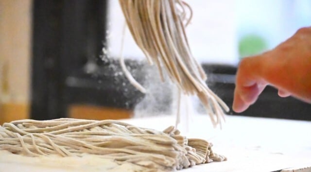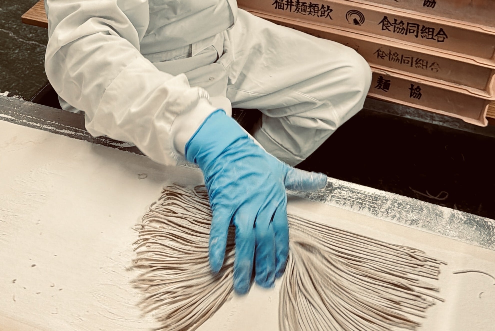 麺づくり一筋。麺の匠 製麺所では、蕎麦粉の香りと水の温度、こねの時間まで徹底的に管理。熟練の職人が手間を惜しまず仕上げる麺は、しなやかでありながら、しっかりとしたコシを持ちます。私たちは「日常の一杯を特別な時間にする」そんな麺づくりを目指しています。